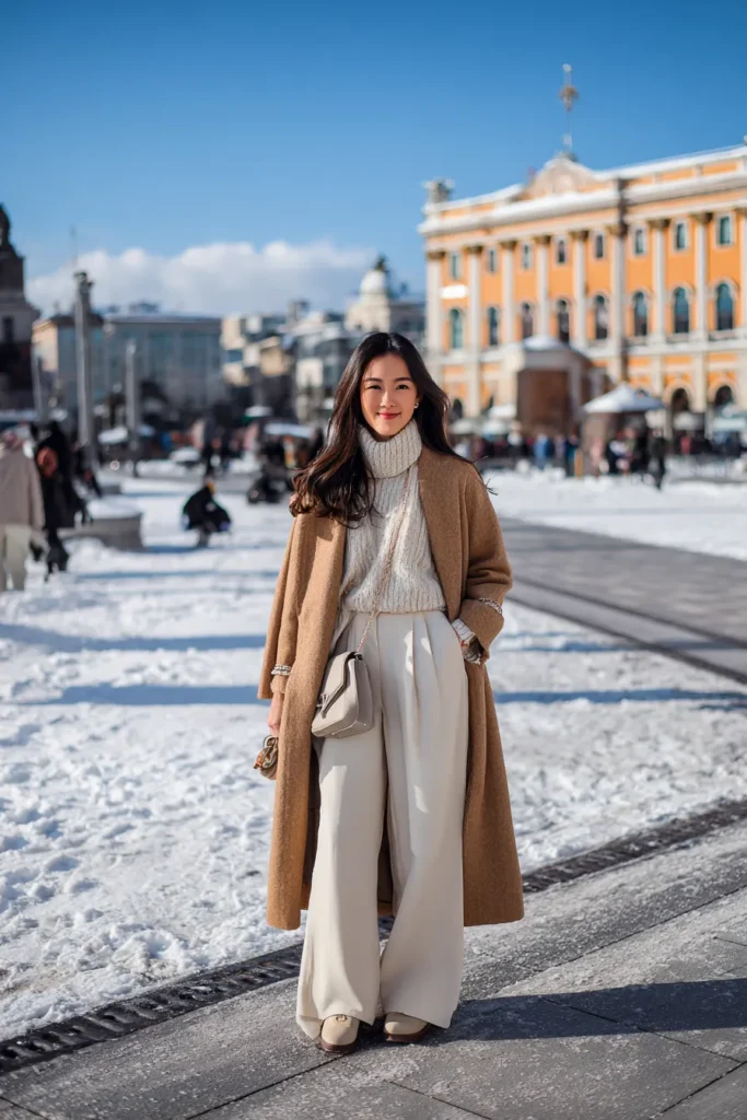 This outfit is the picture of winter sophistication. The long camel coat drapes beautifully over a chunky cream turtleneck, creating a chic layered look that feels both cozy and elegant. Wide leg cream trousers flow effortlessly, giving the outfit a refined yet relaxed silhouette. A small neutral crossbody bag completes the ensemble, adding just the right amount of polish without taking away from the soft, monochromatic vibe.