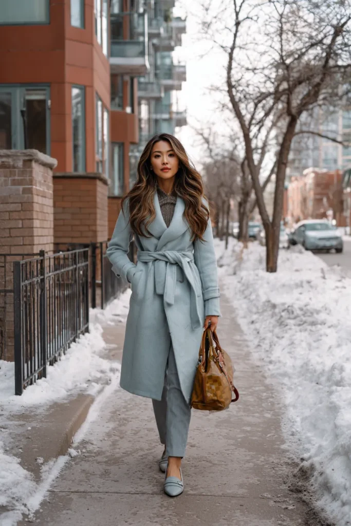 I love how minimal yet powerful this look feels. It’s refined enough for business meetings, but still comfortable and stylish for a city stroll. The powder blue palette gives it a soft, serene vibe, while the accessories keep it sharp and grounded. A true example of chic winter dressing.