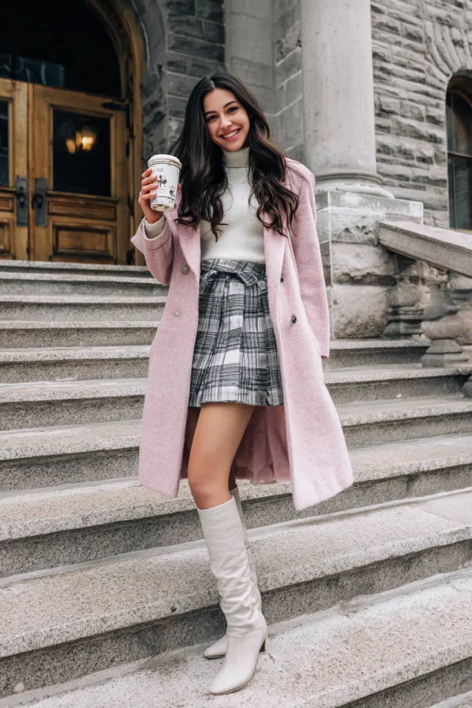 This outfit brings a playful twist to winter layering. A chic plaid skirt paired with a fitted turtleneck creates a feminine base, while the pastel pink coat adds a pop of soft color that feels fresh and fun in the colder months. The knee high white boots not only keep things warm but also tie the whole look together with a polished finish. It’s a mix of cozy textures and girly charm that works beautifully for an everyday winter look.