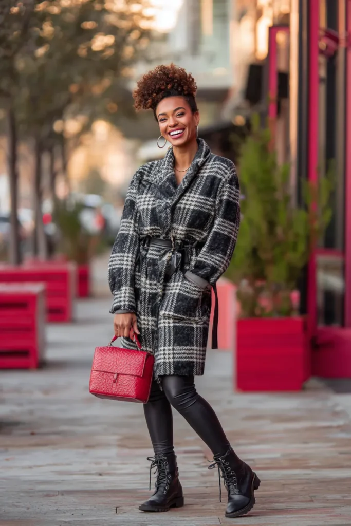 This outfit is the definition of chic winter layering. The bold plaid wrap coat makes a statement while still feeling timeless, especially when cinched at the waist with a sleek belt for a flattering shape. Paired with edgy black leather leggings and lace-up combat boots, the whole look balances classic elegance with a modern twist. The pop of color from the textured red handbag adds just the right amount of bold personality to the outfit.