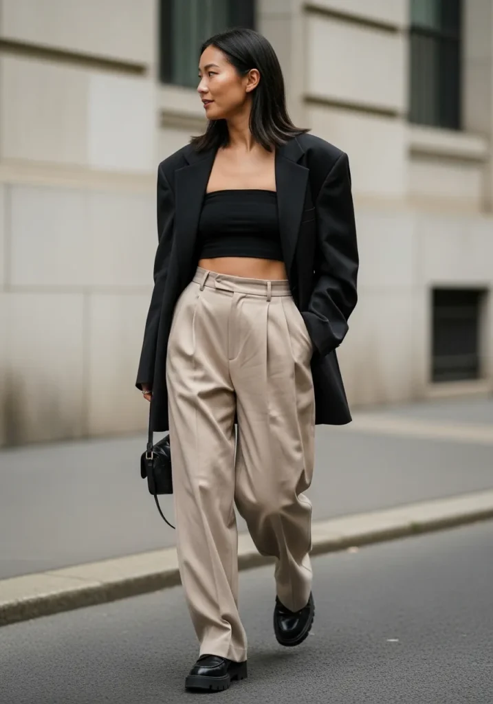 This look combines a cropped black top with high waisted neutral trousers and an oversized blazer. The structured pieces feel sharp while the crop keeps it modern and cool. Paired with sleek shoes and minimal accessories it feels very city ready.