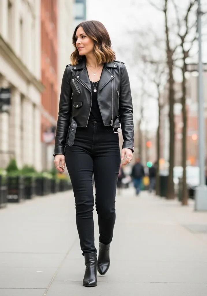 This outfit features a fitted black leather jacket layered over a simple top and paired with black skinny jeans. The monochrome palette keeps it sleek while the leather adds instant attitude. Ankle boots finish the look with a sharp edge.
