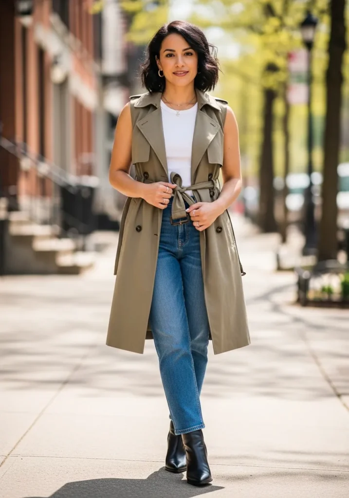 This outfit layers a sleeveless trench style vest over a simple white top and straight leg jeans. The neutral tones keep it clean while the long vest adds movement and structure. It is polished but still very relaxed.