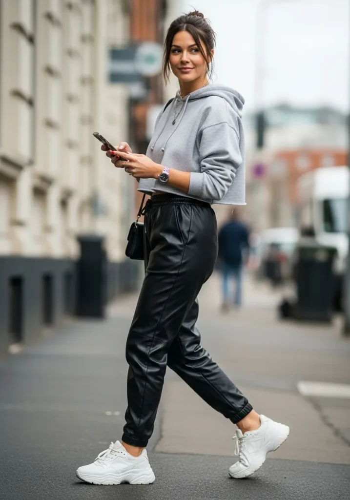 A casual graphic tee is paired with black leather jogger style pants and clean sneakers. The mix of soft and edgy textures makes the outfit interesting without feeling overdone. It is modern street style with a relaxed twist.