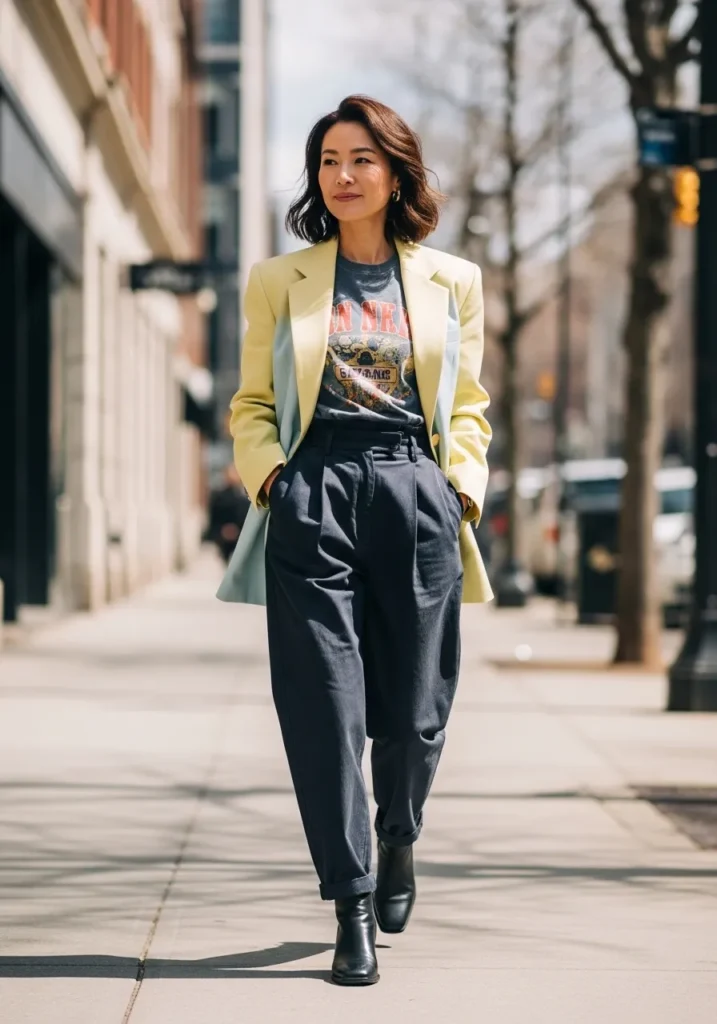 This outfit mixes a bold blazer with a casual graphic tee and relaxed tailored pants. The contrast between the sharp outer layer and the laid back tee gives it a cool street style balance. Finished with sleek boots it feels edgy but still very wearable for spring days.