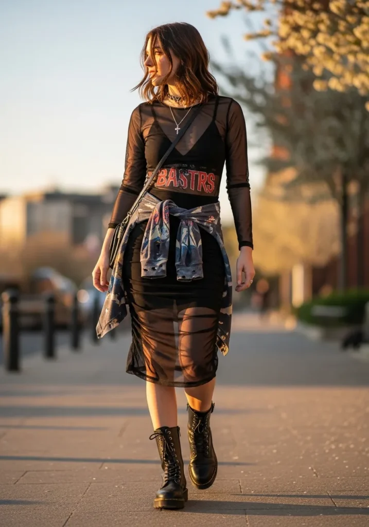 This edgy spring look features a sheer black dress layered over a fitted base and styled with chunky combat boots. The soft flow of the fabric contrasts perfectly with the tough footwear. It feels dramatic but still grounded in everyday street style.