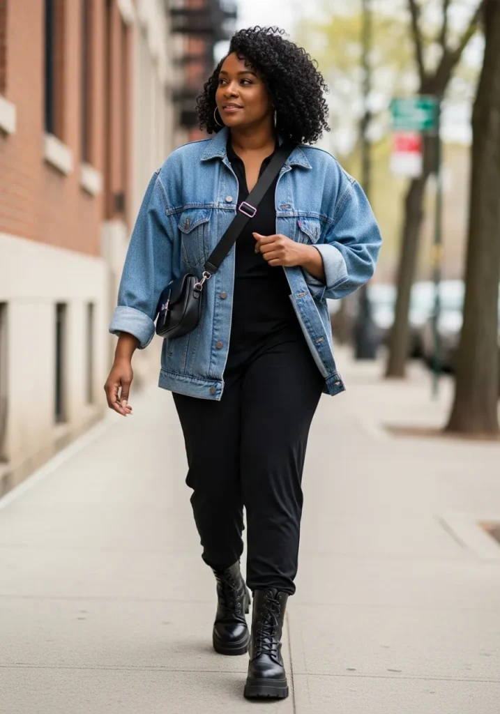 A classic denim jacket is layered over an all black outfit made up of a fitted top and slim pants. The lighter denim breaks up the dark tones and keeps it fresh for spring. Black boots complete the look with a strong finish.