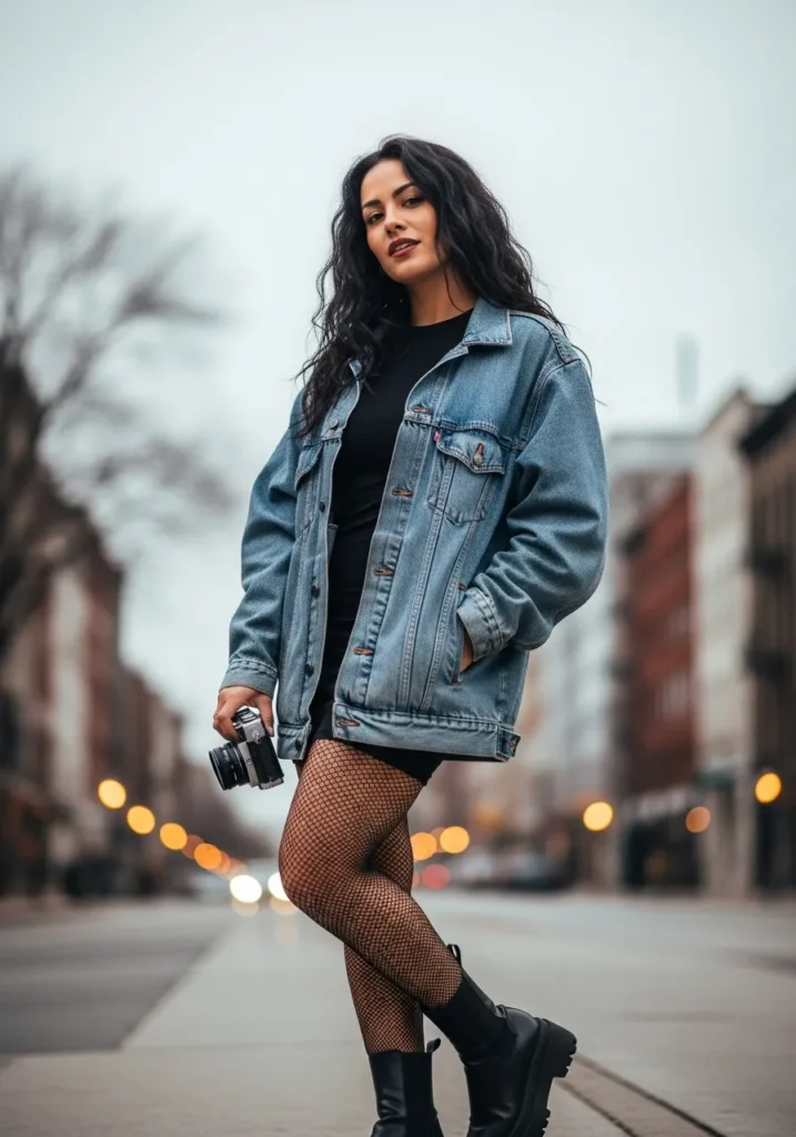 This outfit layers an oversized light wash denim jacket over a black top paired with fishnet tights and chunky black ankle boots. The mix of relaxed denim and bold textures gives the look an effortless street style feel that still reads edgy and intentional. Dark hair and minimal accessories keep the focus on the contrast between soft denim and tough details.