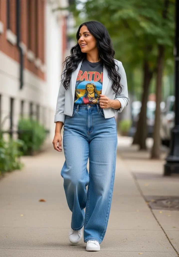 This look pairs a vintage style graphic tee with loose fit blue jeans and casual sneakers. The slightly oversized silhouette gives it that effortless street vibe. It feels comfortable but still stylish enough to stand out.