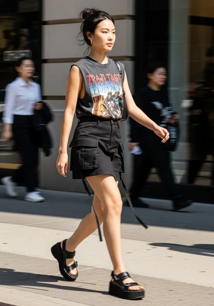 A sleeveless graphic top is styled with a black mini skirt and chunky sandals. The mix of edgy graphics and a simple skirt keeps the look balanced. It feels playful bold and perfect for warmer spring days.