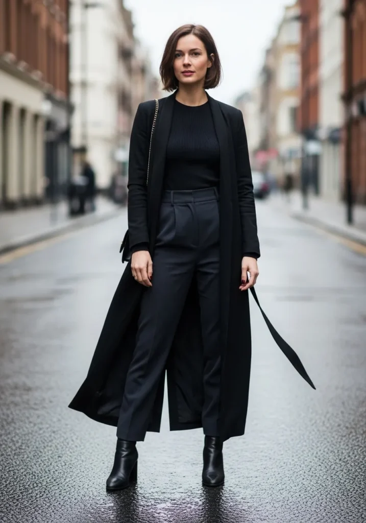 This outfit features an all black base layered with a long lightweight outer piece and finished with ankle boots. The clean lines and dark tones give it a sleek modern edge. It feels powerful and very city inspired.