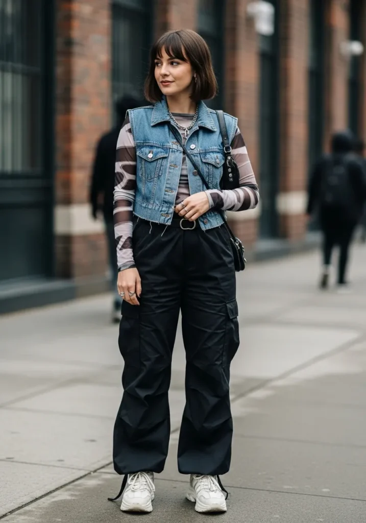 This outfit mixes a cropped denim vest over a striped long sleeve top paired with black cargo style pants and sneakers. The layered textures and relaxed fit give it a casual street look with a slightly rugged edge. It feels playful while still leaning cool and practical.