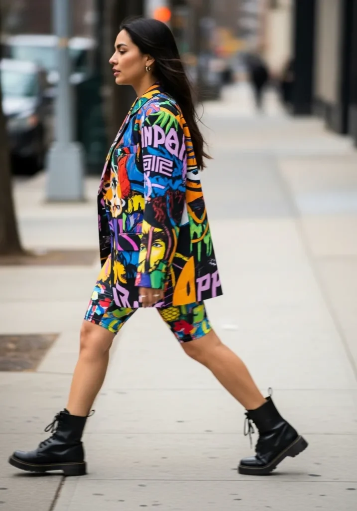 This bold look features a colorful graphic jacket styled as a mini dress paired with chunky black combat boots. The bright patterns instantly grab attention while the boots keep the outfit grounded and edgy. It feels artistic and fearless in the best way.