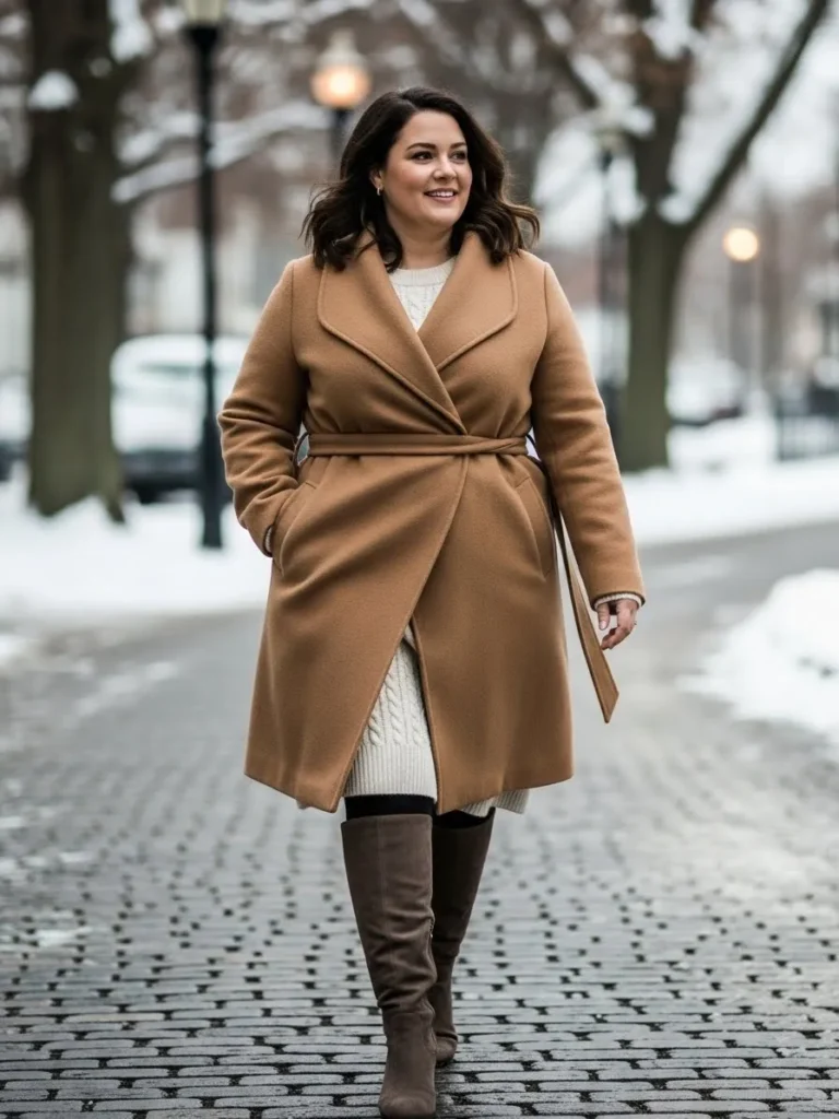 I love this outfit because it proves how powerful simple color pairing can be. The warm brown layered over soft cream feels timeless and flattering on every body type and the wrap style coat adds shape without feeling restrictive. It is one of those looks that makes you feel put together with almost zero effort which is always a winter win in my book.
