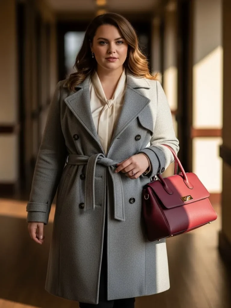 This look pairs a beautifully tailored light grey trench coat with a soft cream blouse that gives the whole outfit a smooth and graceful finish. The coat has that classic double breasted structure with a matching belt that pulls the waist in just right while still feeling comfortable and warm. The rich burgundy handbag adds the perfect pop of color and gives the outfit a little extra personality without overpowering it. The whole vibe feels refined and put together in that effortless way we all wish came naturally every morning.
