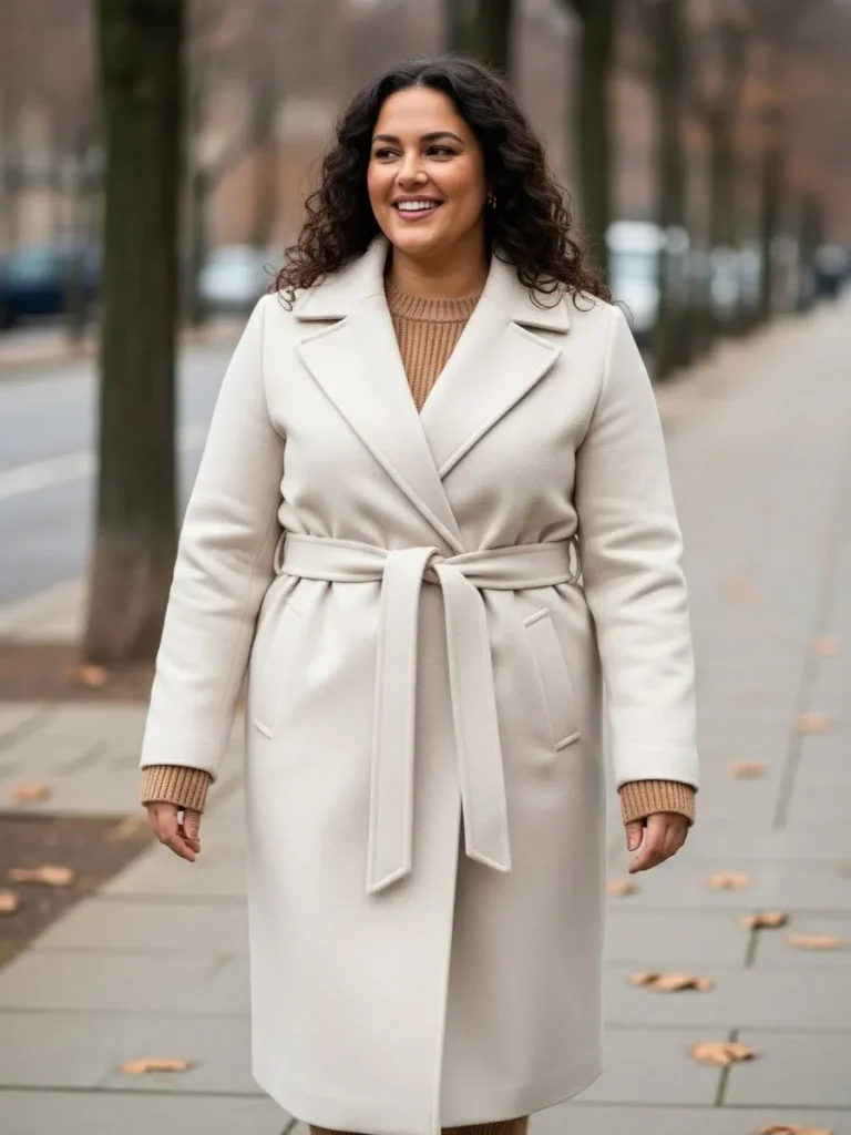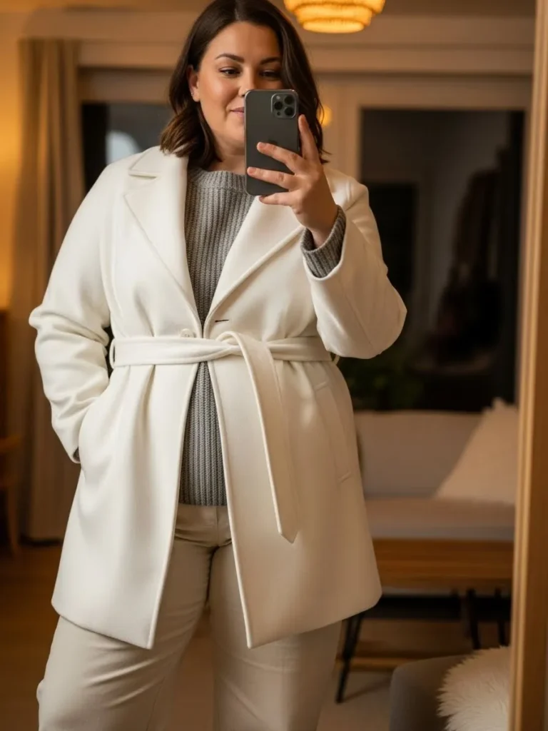 I love this outfit because it balances elegance with total comfort. The coat brightens up a winter day and the belt lets me shape the silhouette exactly how I like it. The soft scarf frames the face beautifully and the contrast between the creamy tones and the dark bottoms makes the whole look feel intentional and chic. It is the kind of outfit I reach for when I want to look stylish without overthinking anything.