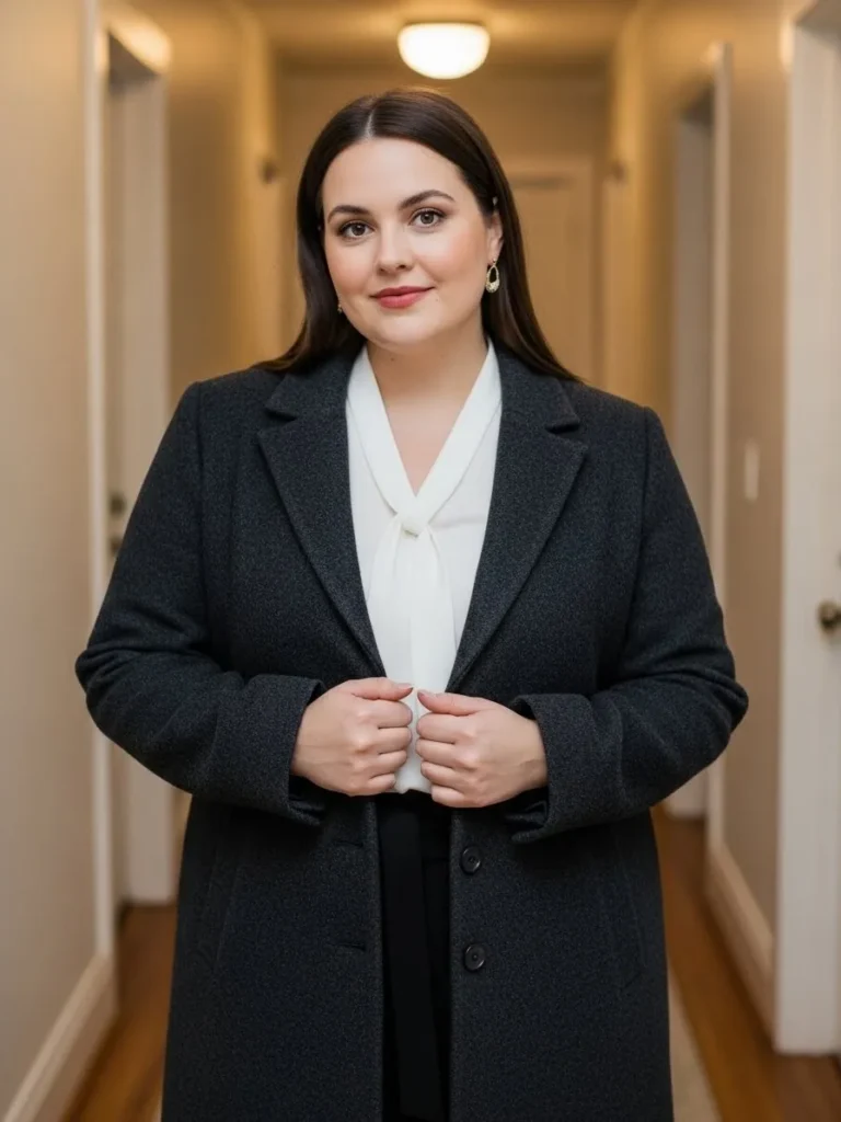 This look brings together a beautifully structured charcoal coat layered over a soft white blouse with a tied neckline that feels both feminine and polished. The coat has a classic tailored shape that creates clean lines while the blouse adds a gentle contrast that keeps the outfit bright and fresh. Pairing these with simple black trousers keeps everything sleek and cohesive and the gold earrings add a subtle hint of shine without pulling focus. The whole vibe is quiet luxury with a confident winter mood that feels refined and timeless.