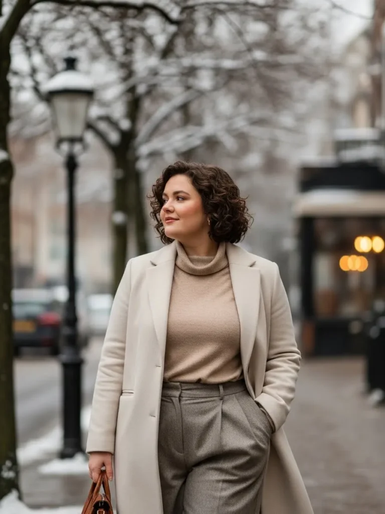 I love how this outfit feels chic without even trying. The monochromatic palette keeps everything looking long and streamlined which is such a flattering trick for winter layering. The tailored trousers give shape while the turtleneck adds softness and the coat ties it all together with that quiet luxury vibe. It is the kind of look that makes me feel confident strolling through a snowy street while still staying perfectly warm and stylish.