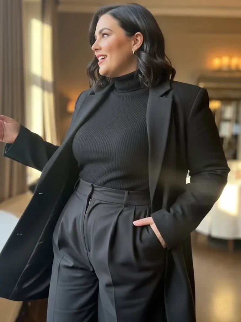I love this look because an all black outfit always feels instantly put together without trying too hard. The high waist trousers highlight the waist in such a flattering way and the fitted turtleneck creates that sleek top half that balances everything so nicely. It is chic, warm, slimming and honestly one of those outfits that makes me feel like the main character even on a Tuesday morning.