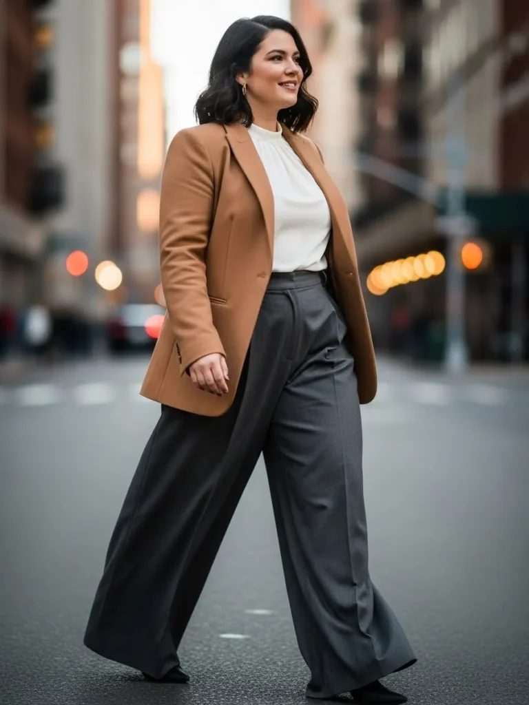 This outfit is all about clean lines and timeless layering. The warm camel blazer instantly adds a refined touch, especially paired with the soft white blouse that feels light and elegant without trying too hard. The wide leg charcoal trousers balance everything beautifully and create that long, fluid silhouette that moves with so much ease. The overall vibe feels modern, confident, and very city chic, the kind of look that works from morning meetings to late afternoon strolls.