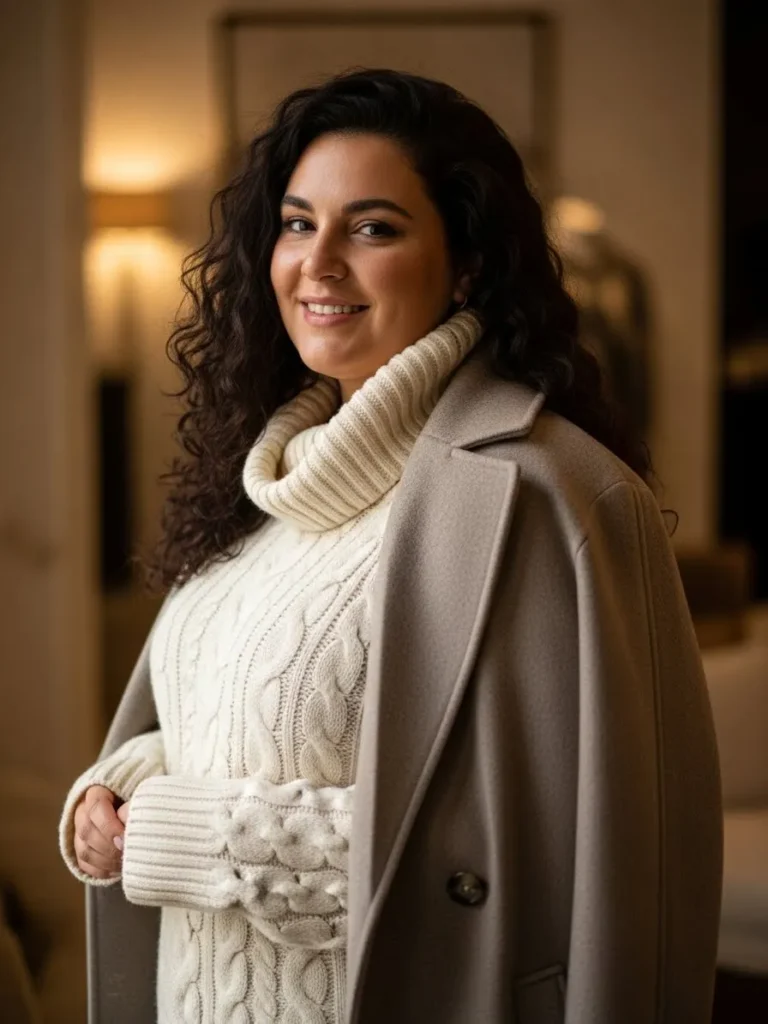 This look is all about soft winter textures coming together in the most effortless way. The chunky cream cable knit turtleneck instantly gives that warm and snuggly feeling, and the oversized fold of the neckline adds a little luxe drama. Layered over it is a beautifully tailored light taupe coat that drapes gently over the shoulders and gives the whole outfit a polished finish. The neutral palette feels calm and refined which makes the entire vibe cozy yet undeniably classy.