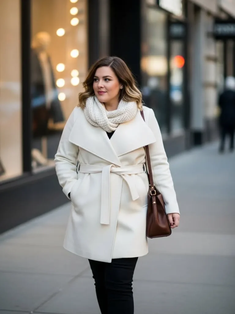 I adore this outfit because it proves that winter whites really do work on everyone. The wrap coat creates such a nice waist shape without feeling restrictive and the knit underneath brings comfort while still looking elevated. I also love how the neutral palette feels calming and elegant which is exactly the mood I want when I’m trying to look classy without overthinking it. This is one of those looks that always makes me feel polished even on days when I’m just running errands.