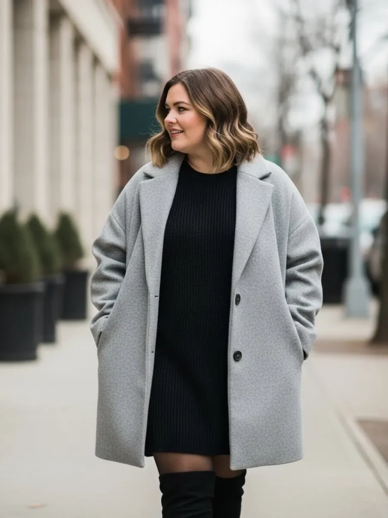 This look pairs a sleek black sweater dress with a soft gray wool coat that instantly lifts the whole outfit into classy winter territory. The textures play beautifully together. The dress has that cozy ribbed knit feel while the coat brings structure with its clean lines and slightly oversized fit. The black over the knee boots keep everything looking long and polished. The whole vibe feels modern, unfussy, and quietly elegant in the best possible way.