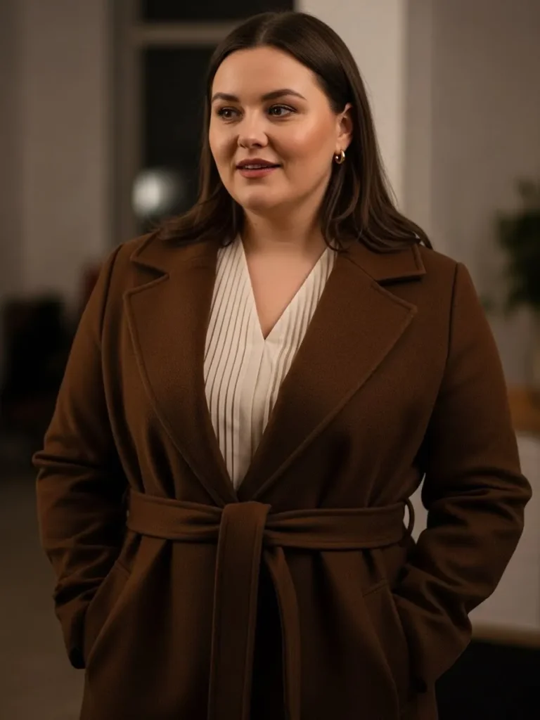This look features a rich chocolate brown wrap coat that instantly feels luxurious without trying too hard. The soft wool texture gives it that cozy winter charm while the self tie belt helps create a beautifully defined waist. Underneath she wears a cream pleated blouse that adds a gentle touch of elegance and lightness to the overall palette. The gold hoop earrings give the outfit a subtle polish that fits perfectly with the warm tones of the coat. Altogether the outfit feels refined relaxed and effortless in the best possible way.