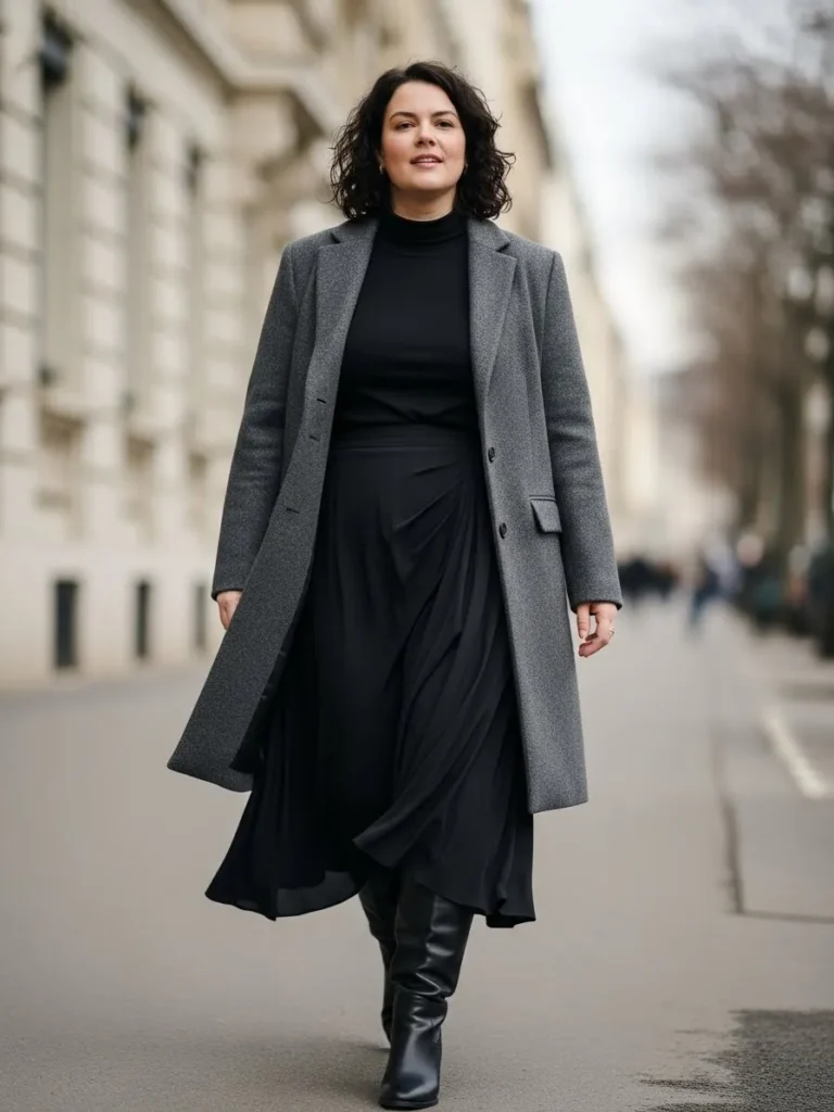 I love how this outfit balances movement and structure. The flowing skirt gives such a feminine feel while the coat adds that quiet confidence I can never resist in a winter look. The monochrome base keeps everything slimming and cohesive and the grey coat softens the black just enough to make it look chic instead of severe. It is the kind of outfit that makes me feel put together even on the coldest days.