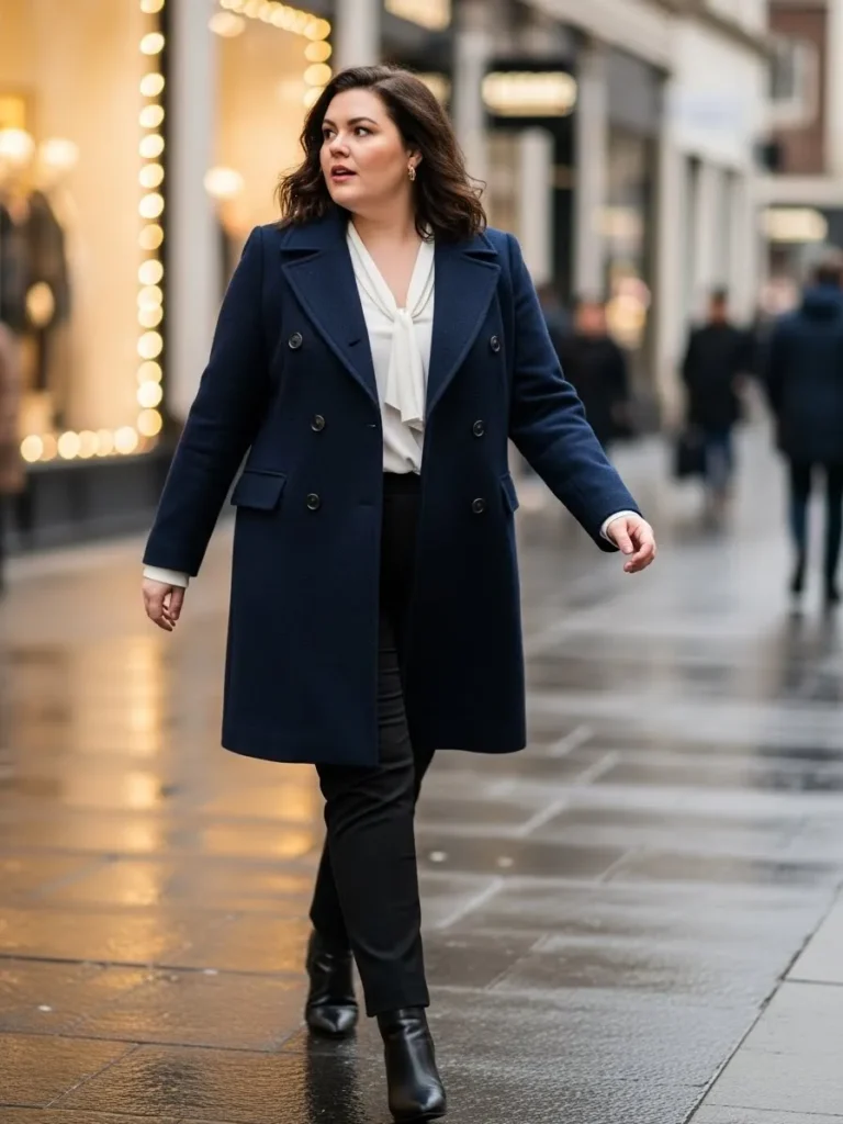 This look feels like the perfect mix of polish and comfort, built around a beautifully structured navy double breasted coat that adds instant sophistication. Underneath, a soft ivory blouse with a loose tie neckline brings a gentle feminine touch that balances the strong tailoring. The black slim trousers keep everything sleek while the black leather ankle boots ground the outfit with a clean winter finish. The overall vibe is that timeless city girl confidence that works from morning errands to an early dinner without needing a single outfit change.