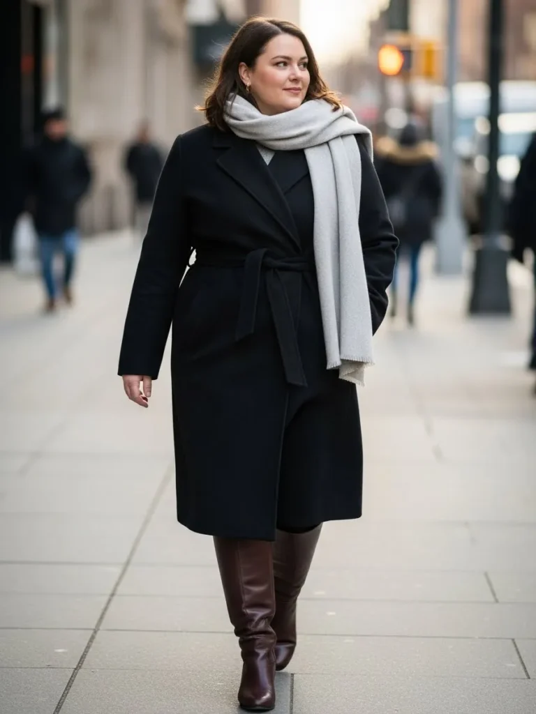 I adore this look because it feels so put together while still being incredibly easy to wear. The wrap coat adds shape in a way that feels flattering on my curves and the soft scarf brings in a gentle highlight near the face which always makes me feel a bit brighter. The tall boots create a long line that feels slimming and gives the whole outfit that polished city girl energy. It is one of those combos I reach for when I want to feel classy without overthinking anything.