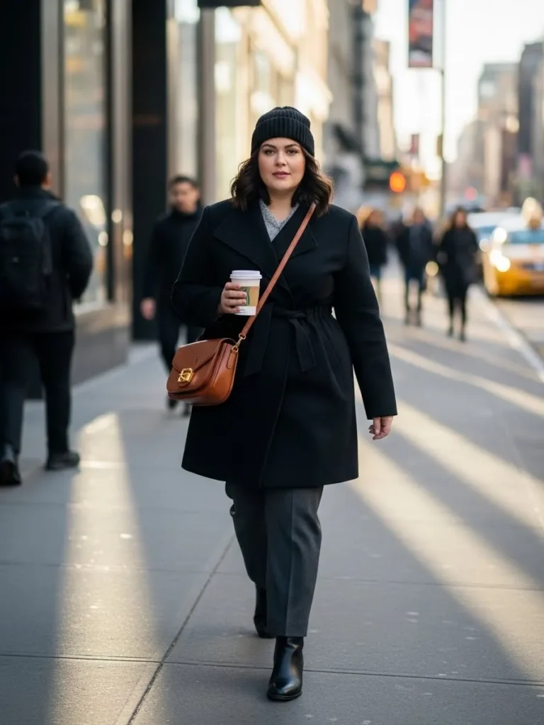 I love this outfit because it blends comfort with a clean silhouette that flatters curves so well. The belted waist creates shape without feeling restrictive and the soft cream blouse brightens the whole look. The structured bag makes everything feel intentional which is my favorite kind of chic. It is one of those winter outfits that makes me feel polished even on days when I am powering through a busy schedule.