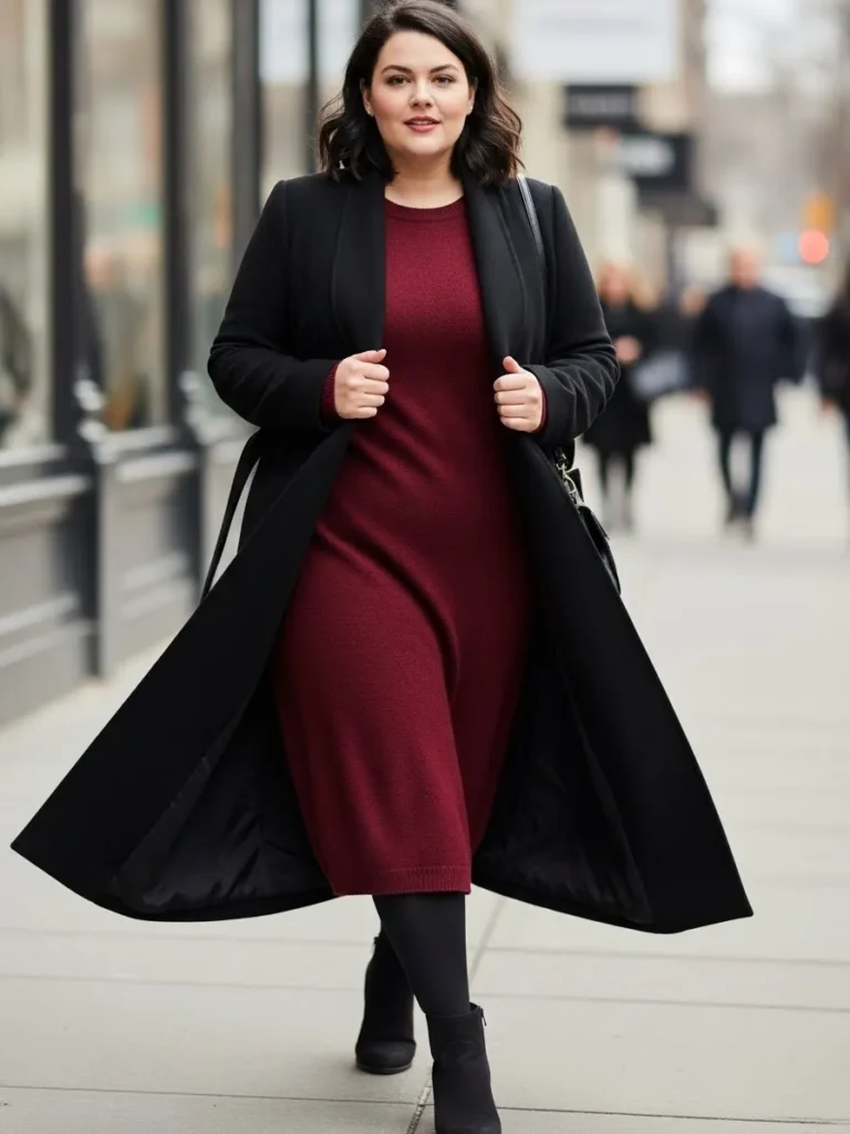 Classic Black Coat With a Cozy Burgundy Knit Dress