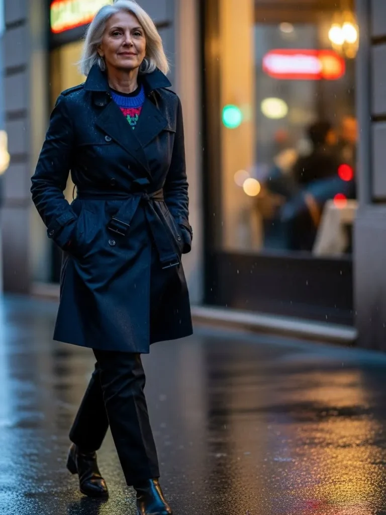 This outfit centers around a classic navy trench coat layered over a soft knit top, paired with slim dark trousers and sleek ankle boots.