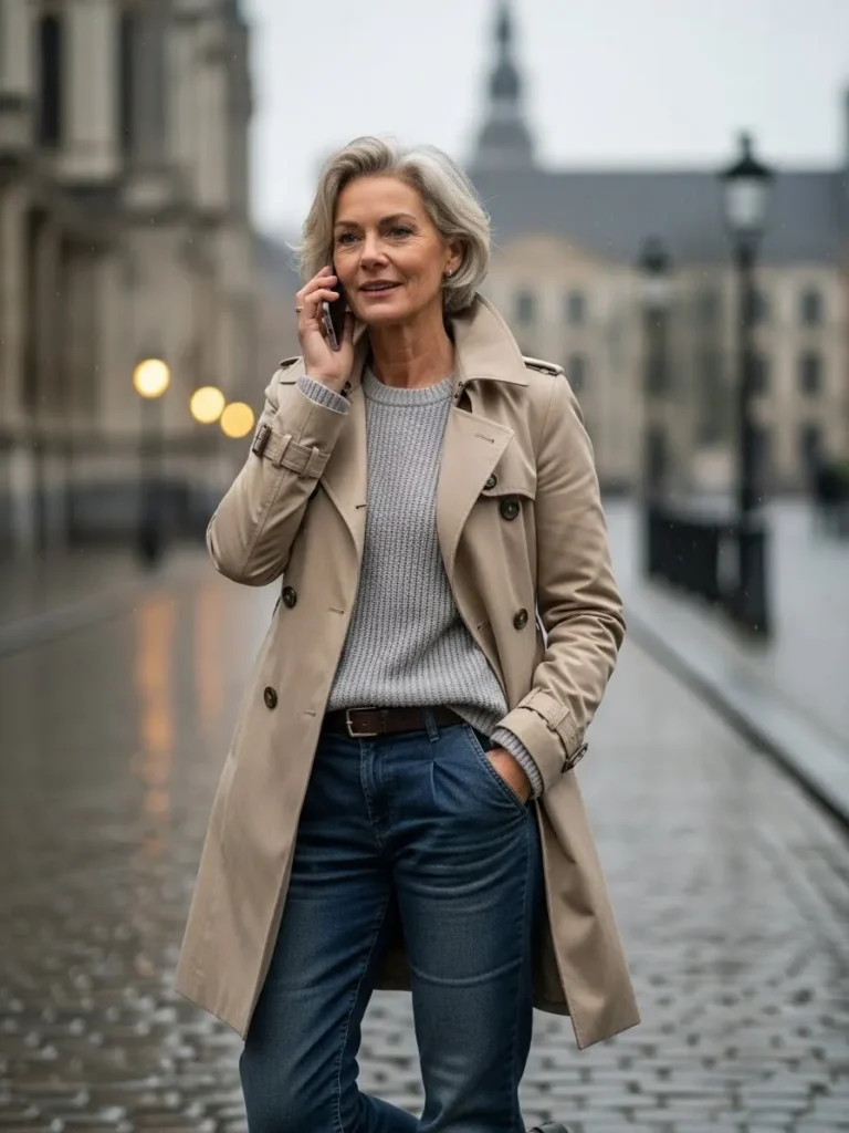A traditional beige trench coat is paired with a knit sweater and relaxed blue jeans.