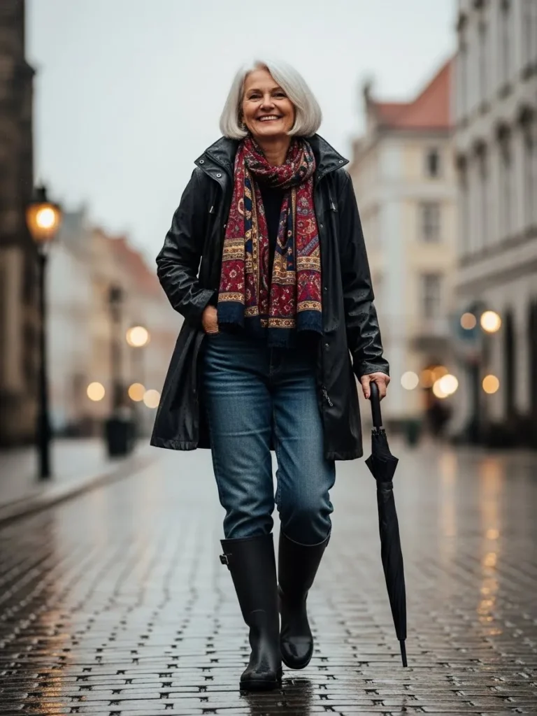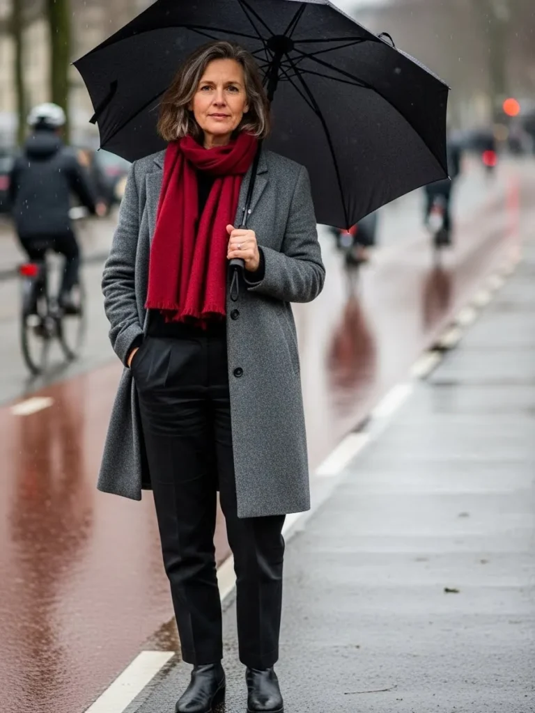 The overall vibe feels calm, classic, and very wearable for a rainy city day.