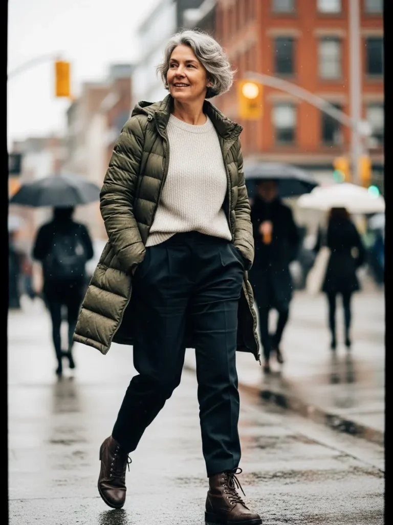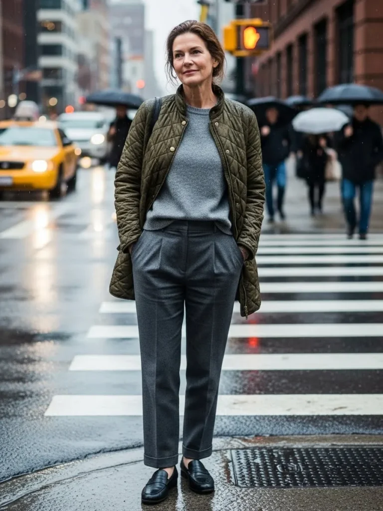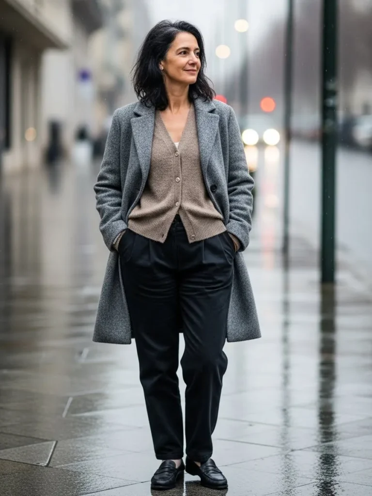 Muted tones make the outfit feel calm and confident, perfect for a rainy city stroll.