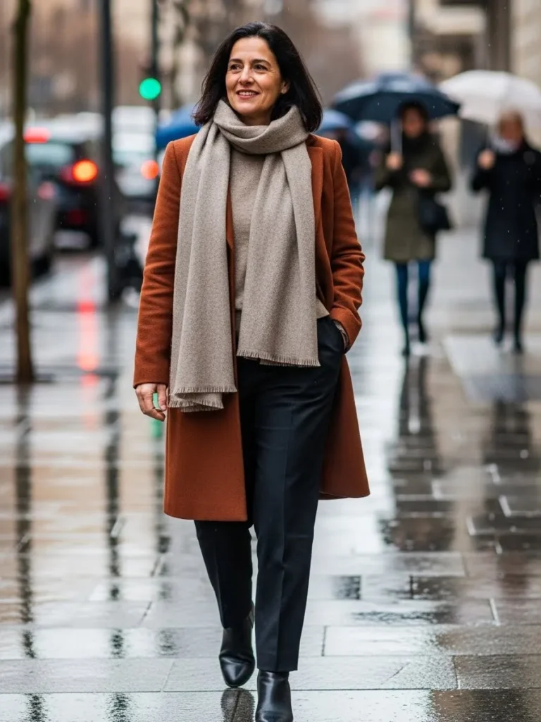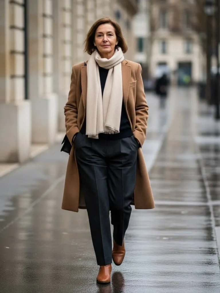 This look pairs a warm camel coat with a soft neutral scarf, dark tailored trousers, and polished shoes.