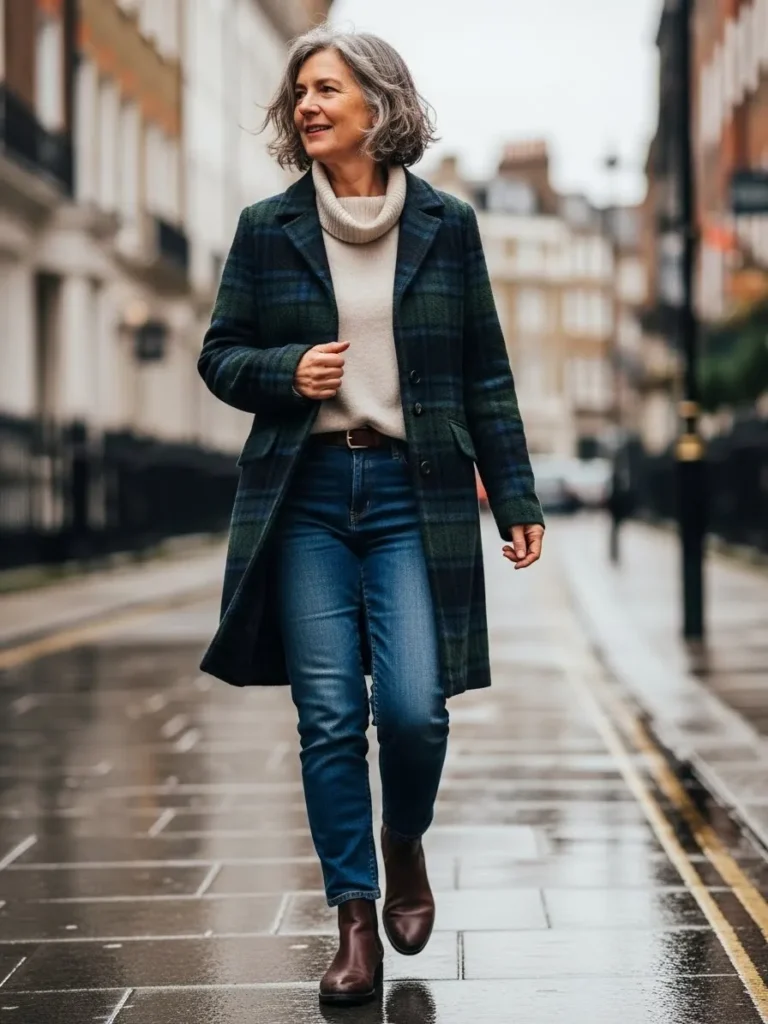 A long plaid coat takes center stage here, layered over a light sweater and classic blue jeans.