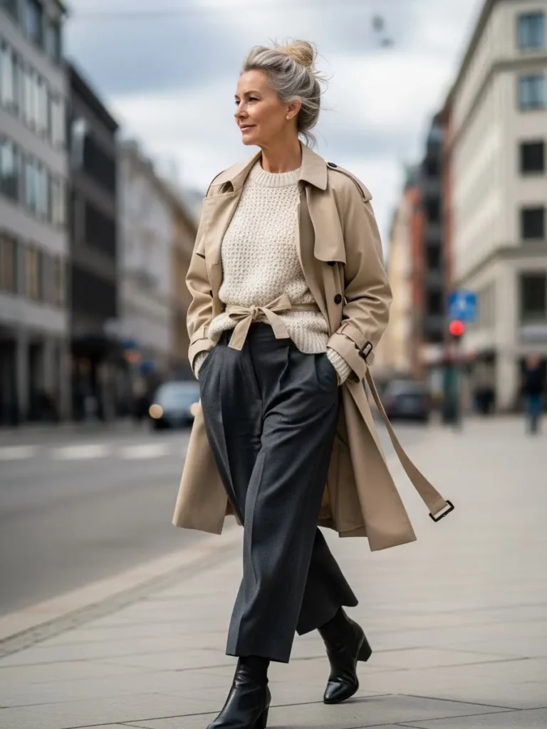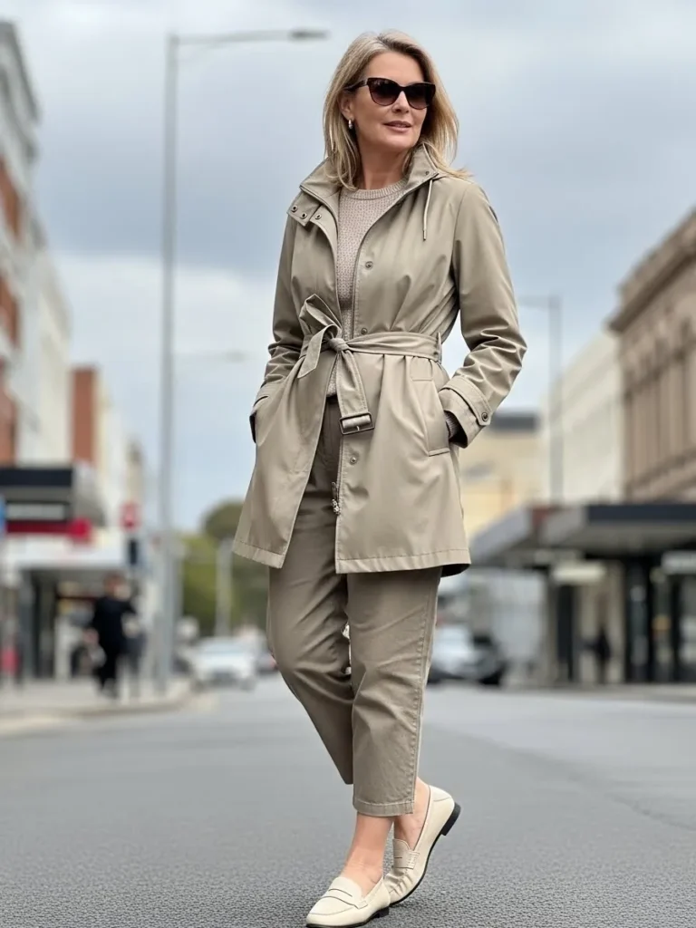 This look pairs a light trench coat with a simple top and relaxed dark trousers, finished with comfortable flats.