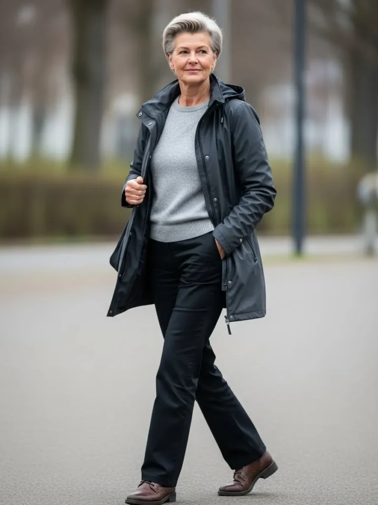 The clean silhouette keeps the look elegant, while the darker tones suit rainy streets perfectly.