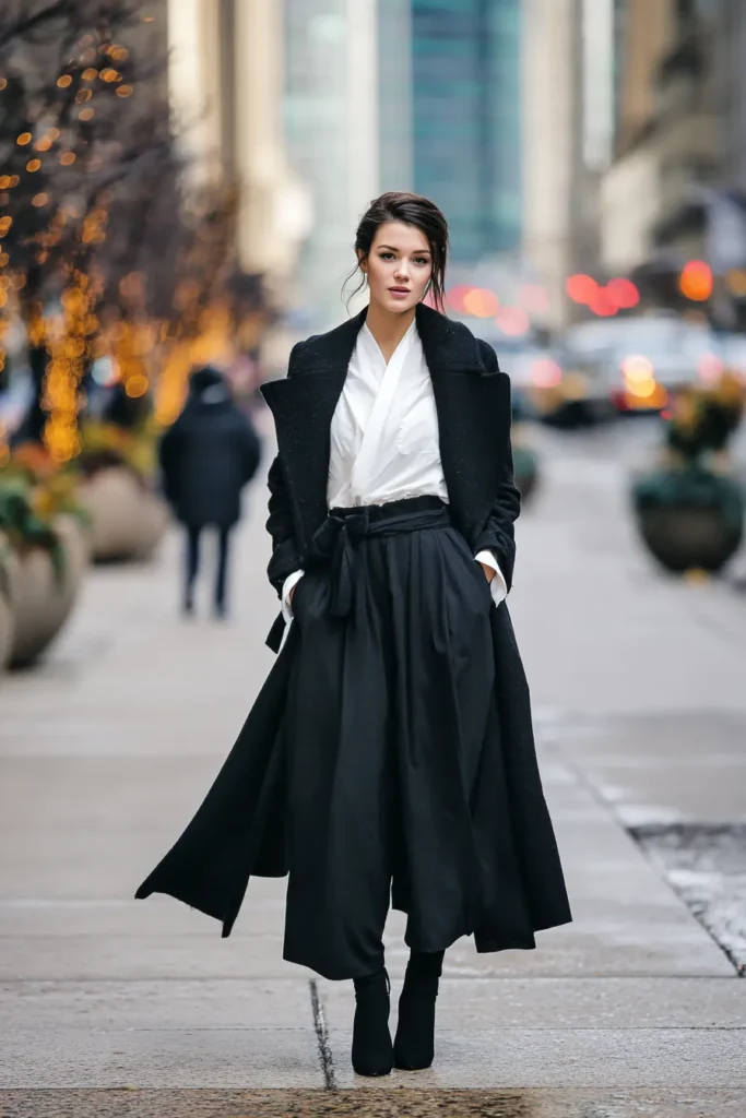 This outfit is the definition of modern elegance. She’s wearing a crisp white blouse tucked into high-waisted black wide-leg trousers, cinched perfectly with a tie belt for a refined silhouette. A long black wool coat drapes effortlessly over her shoulders, and sleek black boots complete the ensemble. The whole look feels polished, structured, and made for turning heads in the city.
