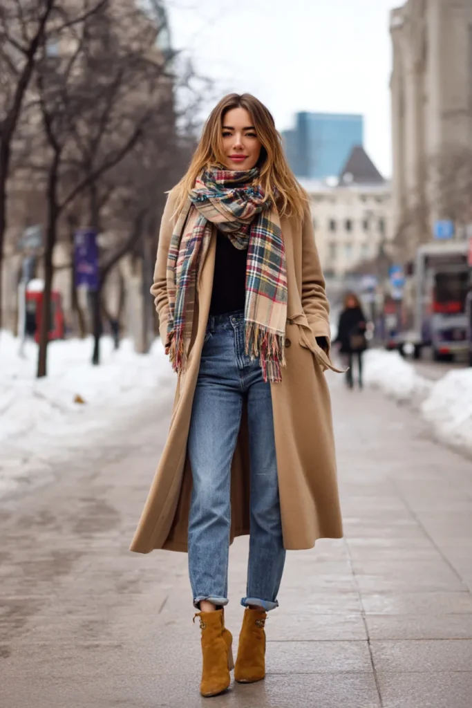 This outfit is the epitome of casual winter chic. She’s wearing a long camel wool coat layered over a simple black top and relaxed blue jeans, perfectly cuffed at the ankles. A colorful plaid scarf adds a cheerful pop of pattern, while mustard suede ankle boots tie the whole look together with a cozy, stylish finish. The result is effortlessly timeless—a look that feels both warm and fashion-forward.