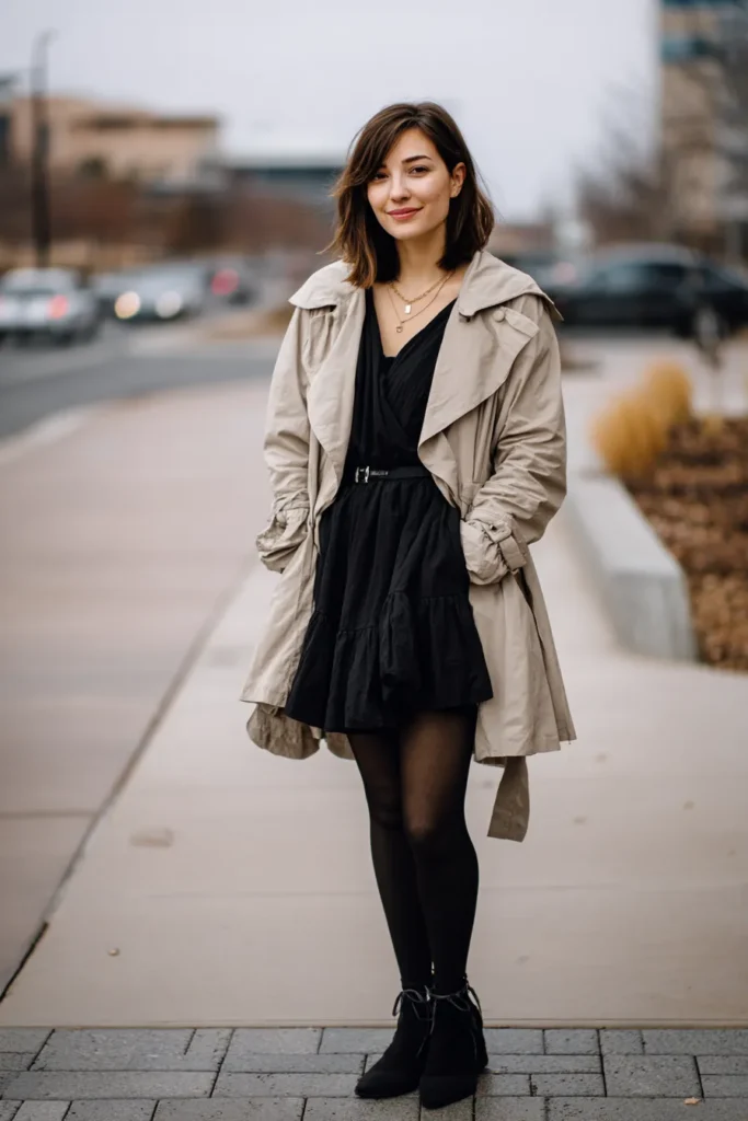 This outfit strikes that perfect balance between playful and polished. The woman wears a short black dress with a belted waist that flatters her figure, paired with sheer tights and chic black ankle boots. Her light beige trench coat adds a timeless touch and creates a beautiful contrast against the darker tones. The layered gold necklaces add a hint of sparkle that keeps the look elegant yet effortless.