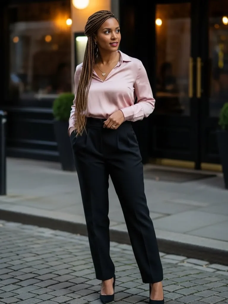I love outfits like this because they feel timeless and flattering on so many body types. The soft pink tone brightens the look while the tailored pants give a clean shape. It is an easy win for anyone who wants to look elegant without feeling stiff or overstyled.