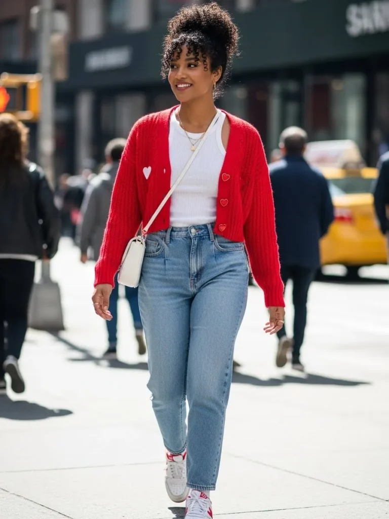 This outfit pairs a bright red cardigan with subtle heart details over a simple white tank and classic blue jeans. The relaxed fit keeps everything casual while the pop of red gives strong Valentine energy. Sneakers and a crossbody bag make it practical and cute for daytime plans. The vibe feels playful, fun, and effortlessly charming.