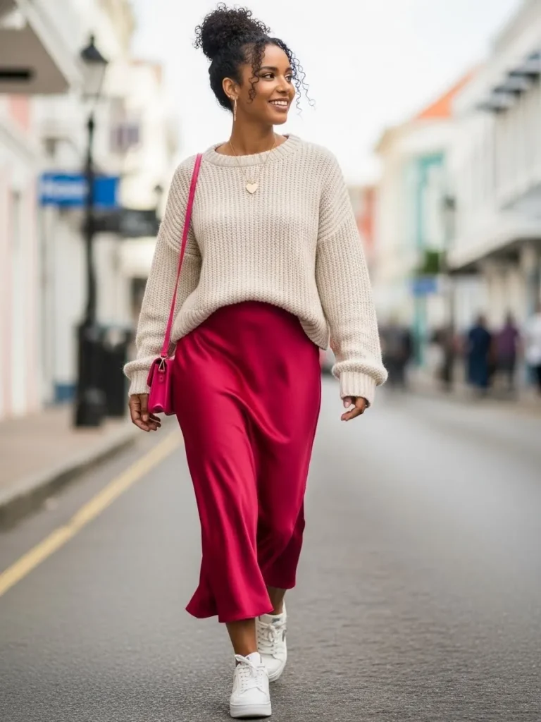 This outfit combines a soft neutral knit sweater with a rich red satin midi skirt for a beautiful mix of cozy and elegant. The sweater drapes effortlessly while the satin skirt adds shine and movement. White sneakers keep the look relaxed and modern. The overall feel is romantic, soft, and stylish.