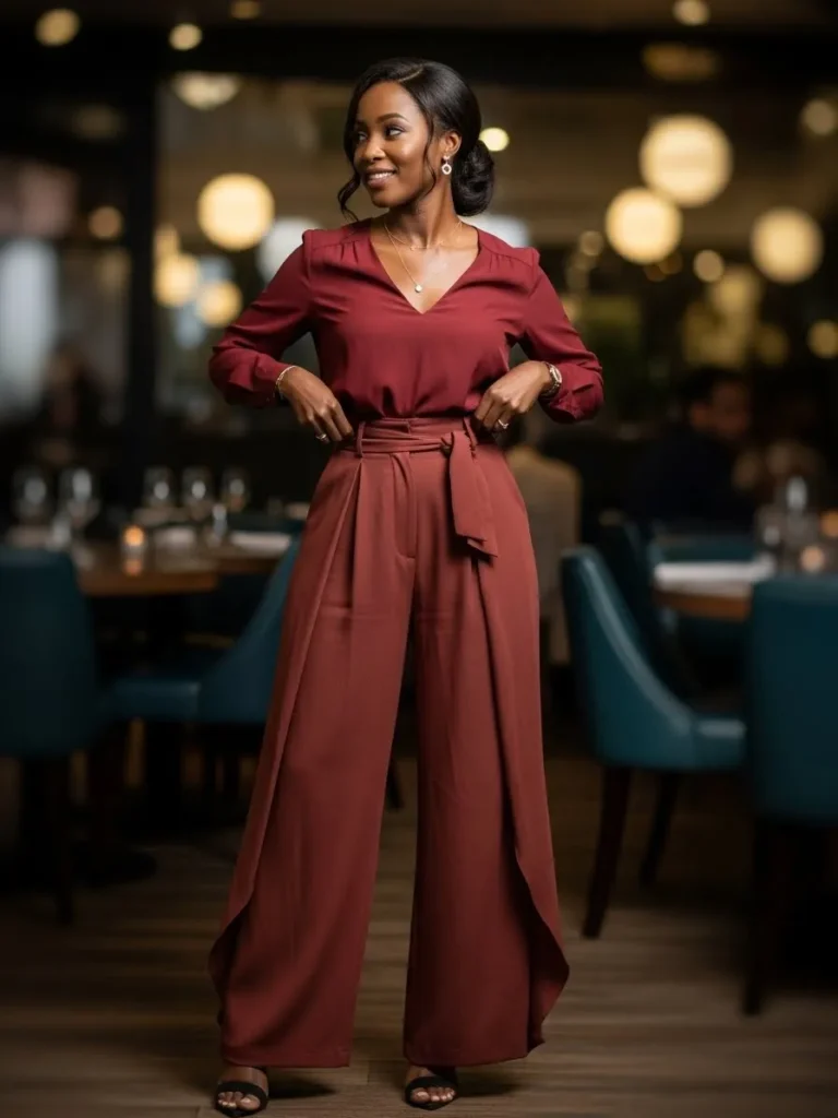 This look features a deep wine colored blouse tucked into matching wide leg trousers with a tied waist detail. The fabric looks soft and flowy, creating a graceful silhouette that moves beautifully. Simple heels complete the outfit without overpowering it. The vibe feels elegant, romantic, and dinner ready.