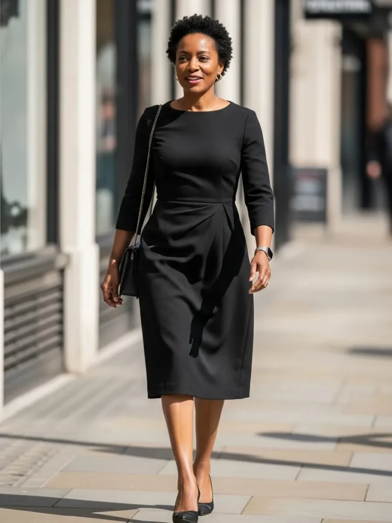 This outfit features a classic black midi dress with a clean neckline and three quarter sleeves. The tailored fit gently defines the waist while keeping everything elegant and understated. Simple heels and a small shoulder bag finish the look. The vibe feels timeless, confident, and sophisticated.