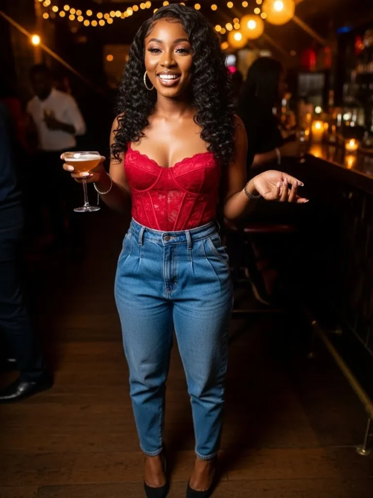 This outfit features a striking red lace corset style top paired with high waisted blue jeans for a confident night out look. The structured top highlights the waist and neckline while the denim keeps everything balanced and wearable. Simple heels and minimal accessories let the bold red take center stage. The overall vibe feels flirty, fun, and perfect for a Valentine evening at a bar or lounge.